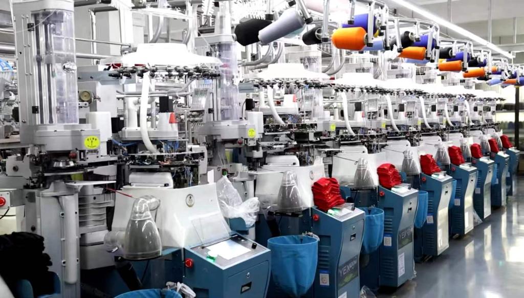圖為遼寧木色襪業有限公司生產車間,一排排織襪機正在工作。(受訪者供圖)