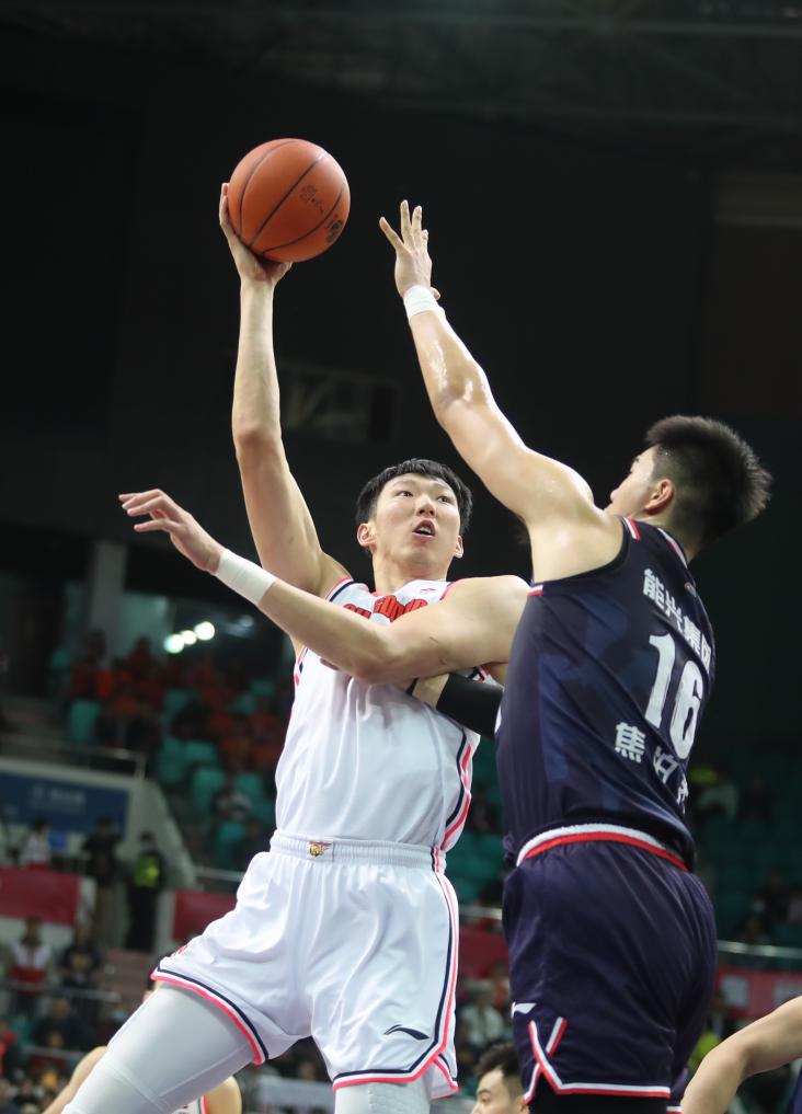 1月3日,廣東隊球員周琦(左)在比賽中投籃。新華社發(阮育軍攝)