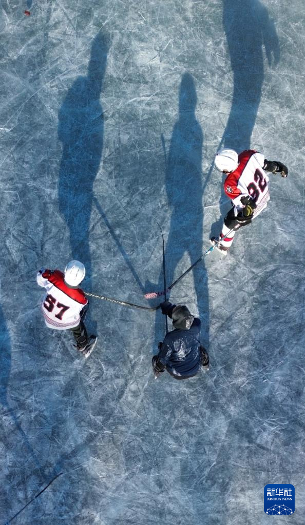 1月7日,冰球愛好者在沈陽市勞動公園人工湖上打冰球(無人機照片)。新華社記者 陳為 攝pagebreak