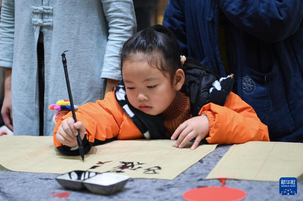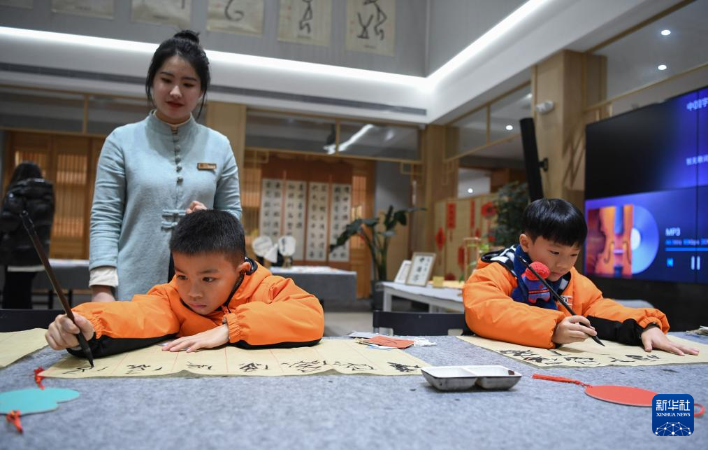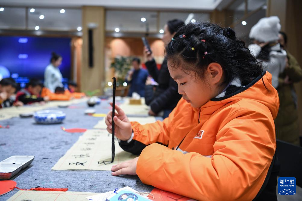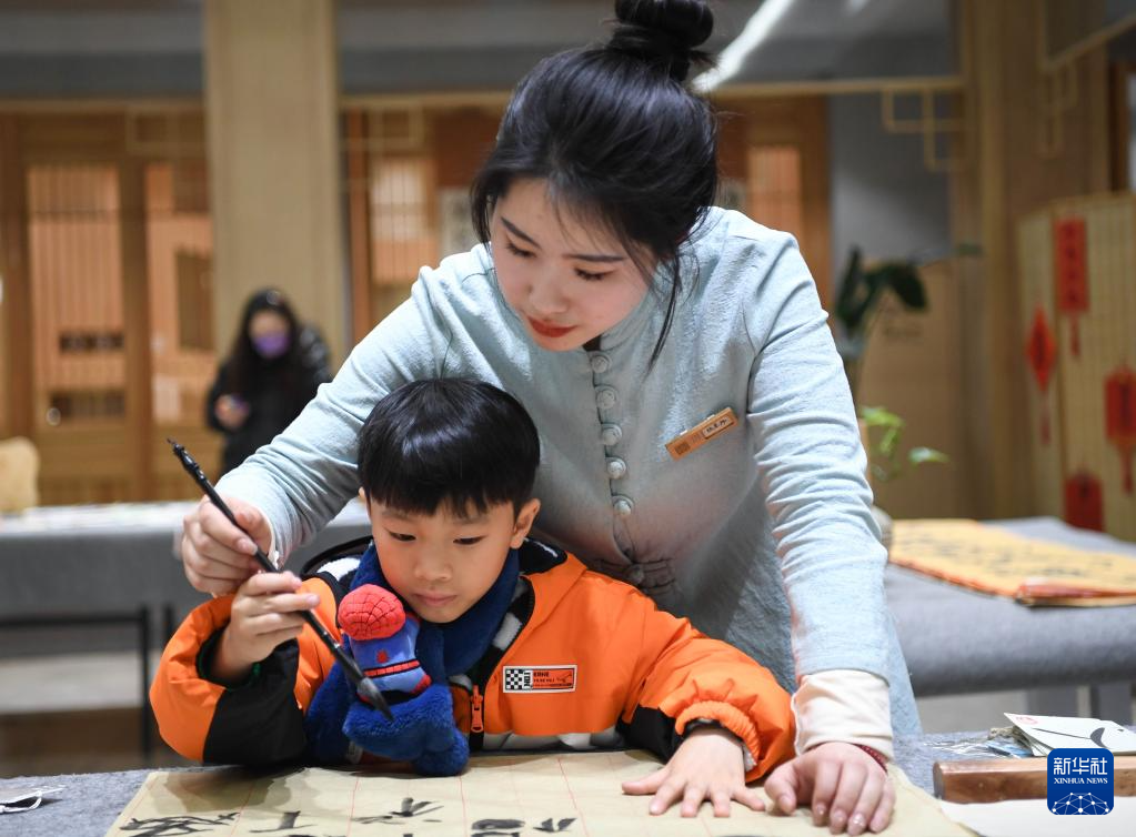 1月7日,“小沃柑”在沈陽老北市漢字主題書房體驗書法。新華社記者 龍雷 攝