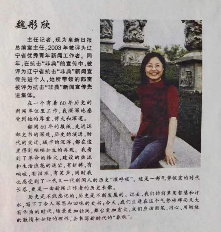 魏彤欣1993年進入阜新日報社做記者,她給自己定的努力方向就是:到一線去,到平凡的生活中去,歌頌美好情操,弘揚時代精神。她撰寫的20余篇新聞作品榮獲省級以上新聞獎項,她本人榮獲阜新市十大女杰、遼寧省十佳新聞工作者等多項榮譽。