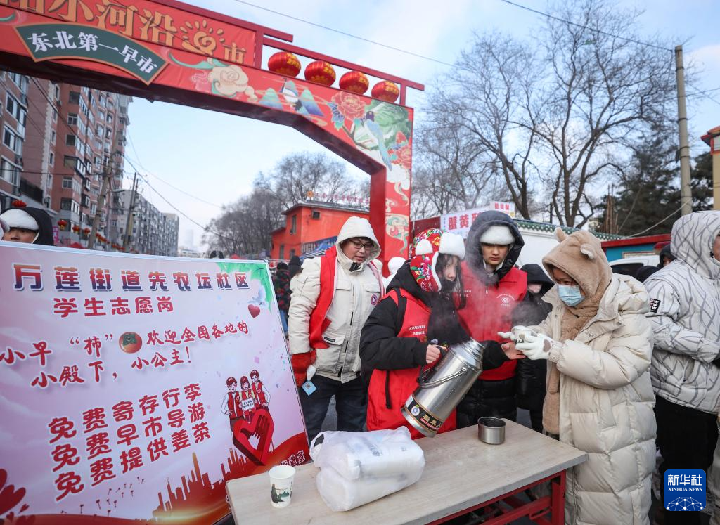 1月21日,在沈陽小河沿早市,志愿者為游客提供免費熱水。新華社記者 龍雷 攝
