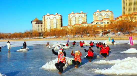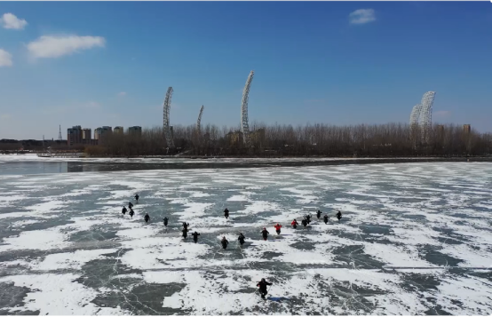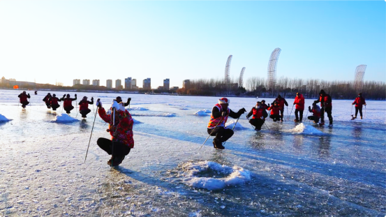 圖為“單腿驢”愛好者們在冰面上滑行。遼中區委宣傳部供圖pagebreak
