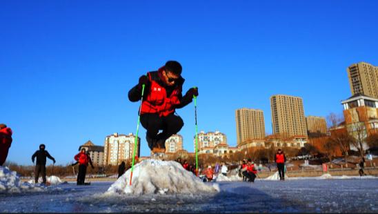 單刀冰車俗稱“單腿驢”,由滿族民間傳統冰雪運動“滑冰車”演變而來。據介紹,遼中區“單腿驢”大隊由百余名愛好者組成,競速比賽、穿越障礙、跨越雪堆、鉆雪洞、“8”字環繞花樣等花式玩法,吸引了眾多市民駐足觀看。