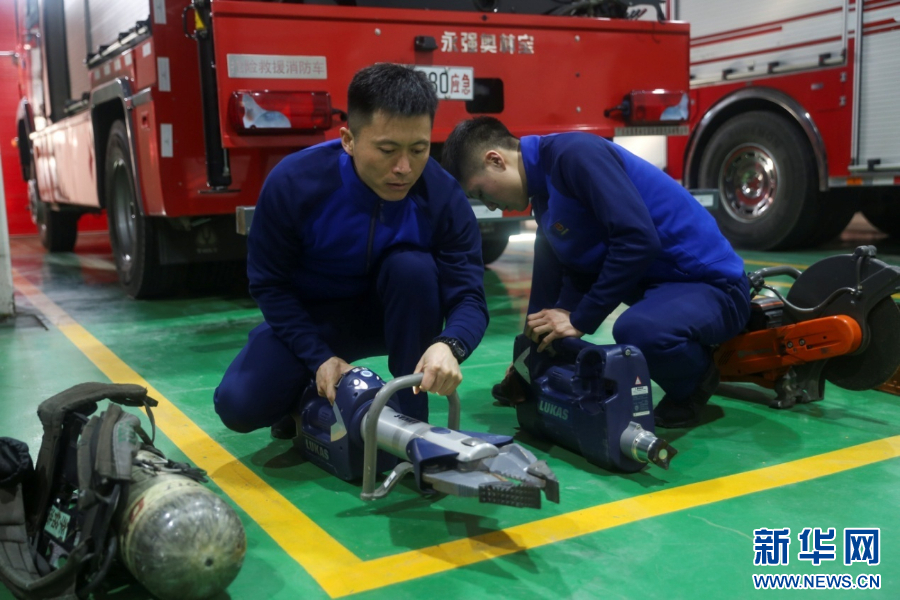 圖為消防員檢查車輛和裝備器材。新華網許志康攝