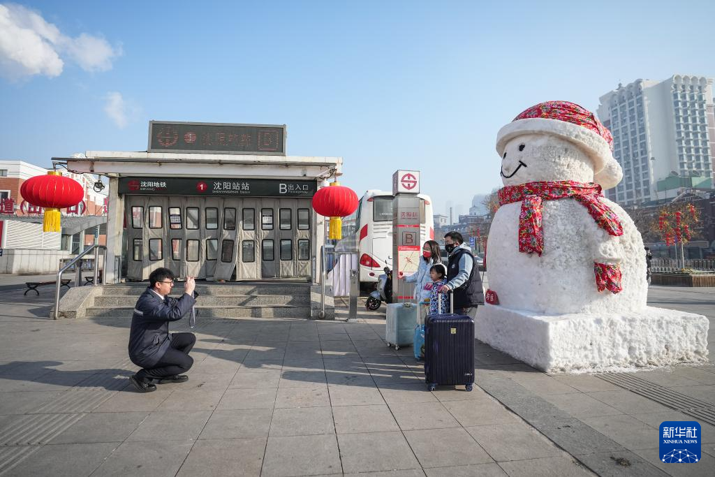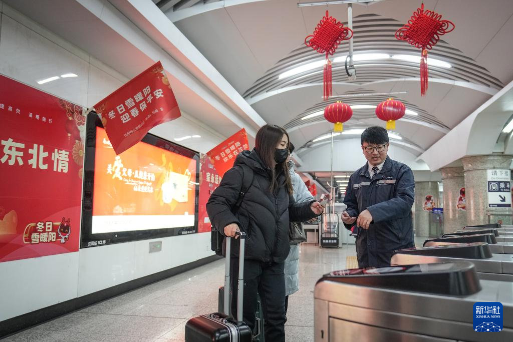 2月9日,孫雷在“沈陽站站”站內幫助旅客進站乘車。新華社記者 潘昱龍 攝
