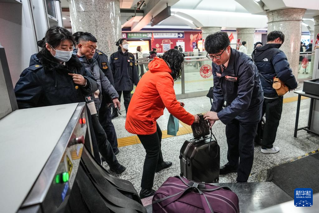 2月9日,孫雷在“沈陽站站”站內的安檢處協助乘客進站。新華社記者 潘昱龍 攝