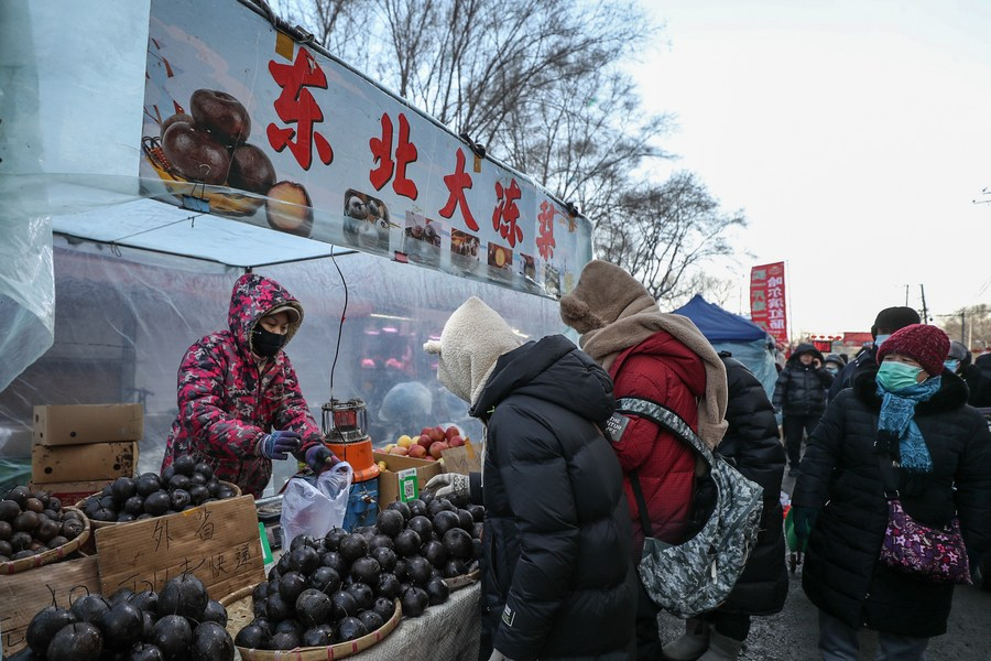 游客在沈陽小河沿早市購買凍梨。新華社記者 潘昱龍 攝