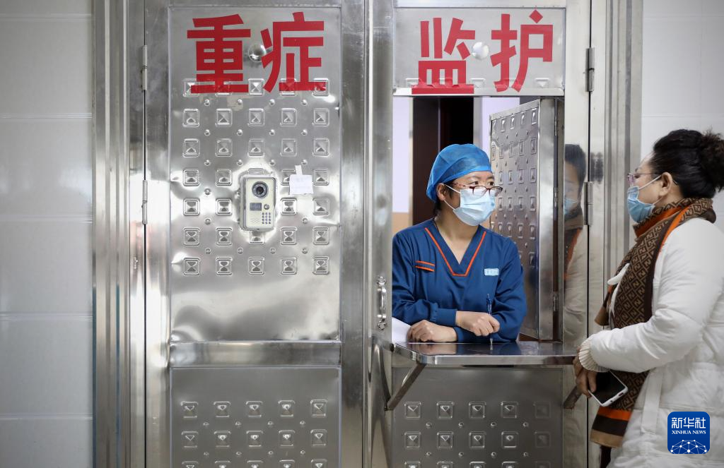 3月5日,家屬探視時間,曾艷紅(右二)在ICU病房內鼓勵患者及家屬要有信心。新華社記者 姚劍鋒 攝pagebreak