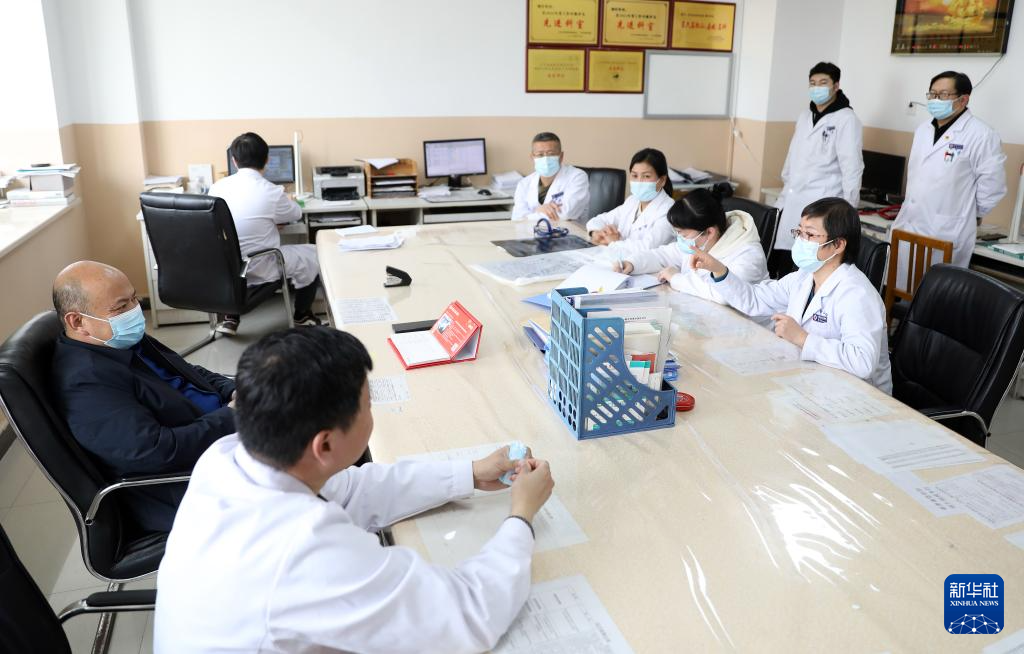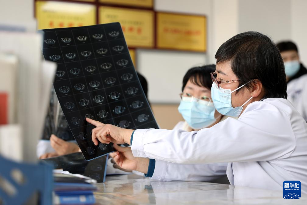 3月5日,曾艷紅(前)在神經外科醫生辦公室參與全院會診,和其他醫生一起分析一名患者的病情。新華社記者 姚劍鋒 攝pagebreak