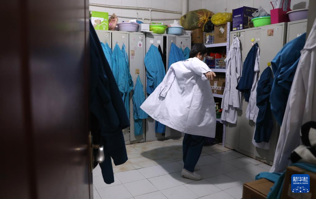 3月5日,在接到醫院會診通知后,曾艷紅在ICU醫護更衣室穿上白大褂。新華社記者 姚劍鋒 攝pagebreak