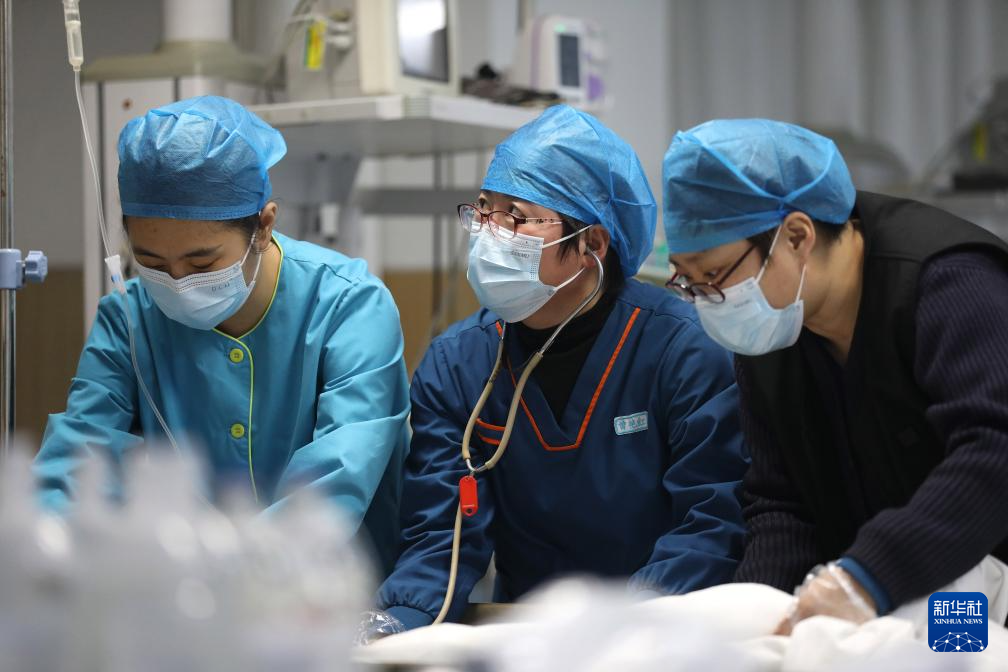 3月5日晚上,曾艷紅(中)和ICU夜班醫生李秀波(右)將術中大出血的產婦轉入ICU病房后,開展監測和治療。新華社記者 姚劍鋒 攝pagebreak
