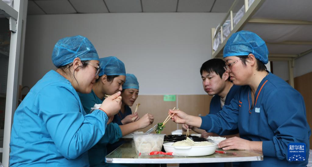 3月5日,除了值班人員外,曾艷紅(右一)和ICU醫護人員在休息室匆忙地吃午飯。新華社記者 姚劍鋒 攝