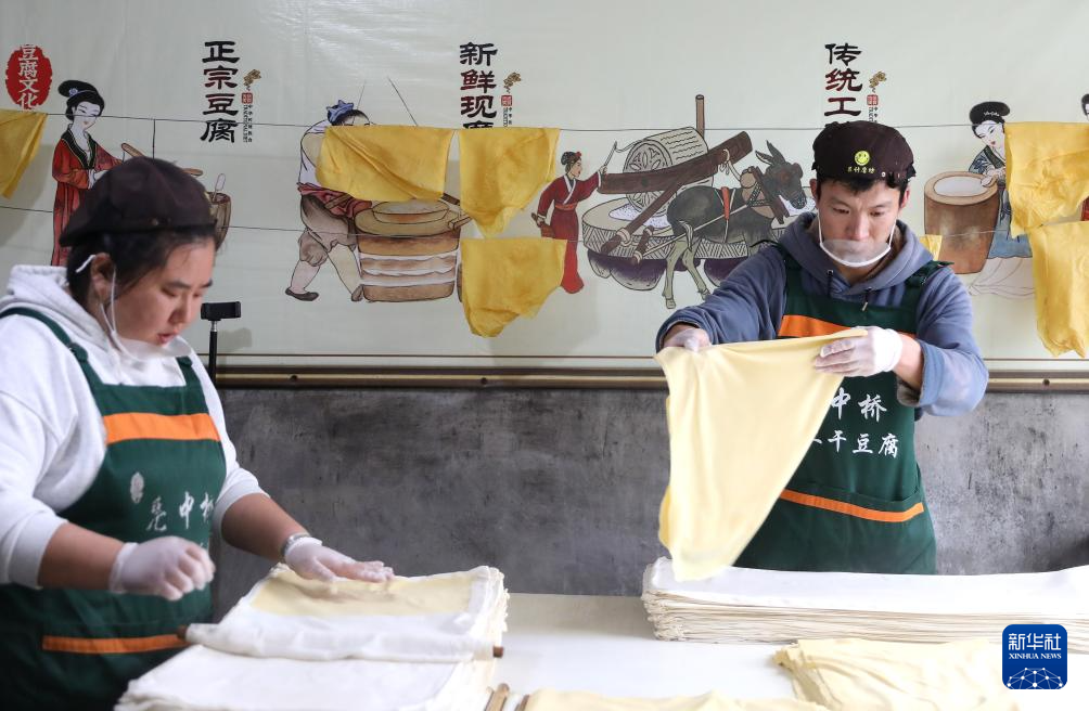 3月22日,呂計磨坊創始人呂宏宇(右)和妻子計飛飛在自家制作手工干豆腐。新華社記者 姚劍鋒 攝