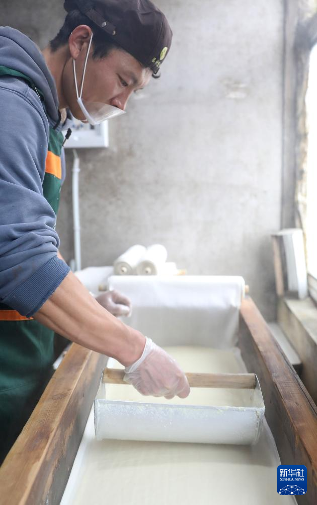 3月22日,呂計磨坊創始人計飛飛在自家制作手工干豆腐。新華社記者 姚劍鋒 攝