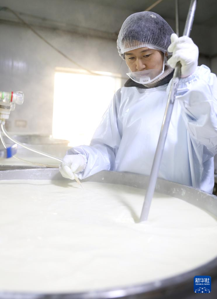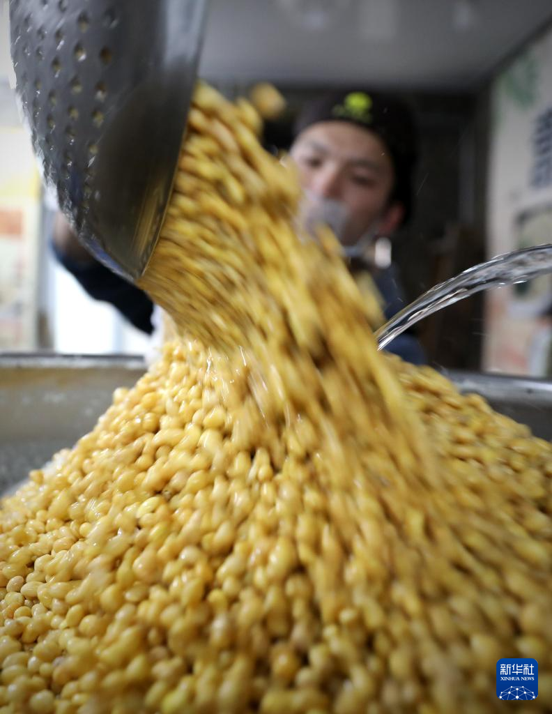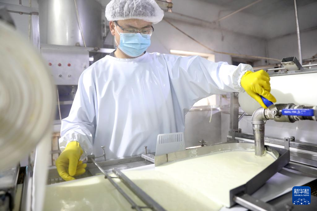 3月21日,工人在亮中橋鎮的昌圖紅瑞食品釀造有限公司車間豆漿鍋內一邊點鹵水,一邊進行攪拌。新華社記者 姚劍鋒 攝