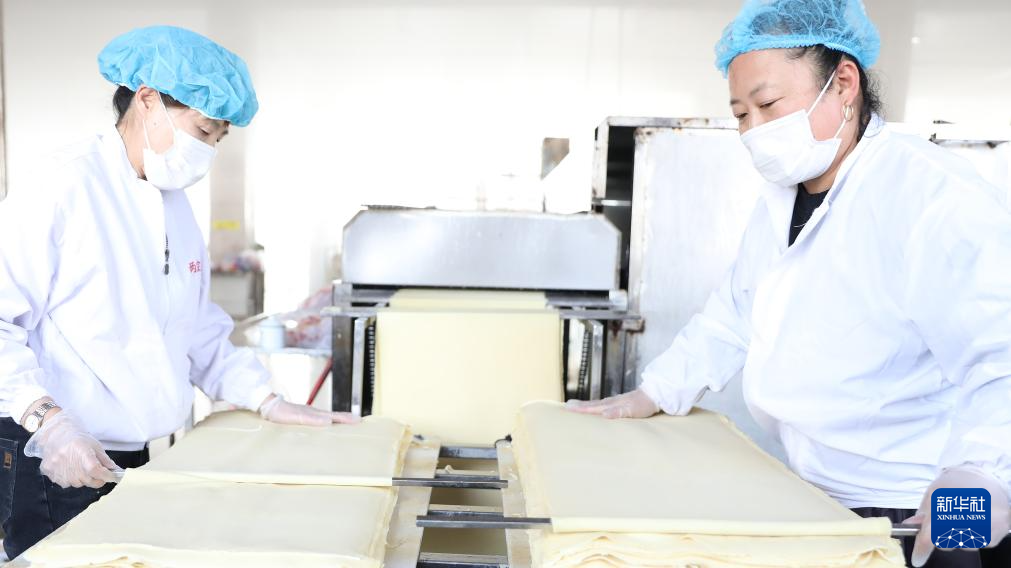 3月21日,工人在亮中橋鎮的昌圖福源食品有限公司車間內將做好的干豆腐鋪開。新華社記者 姚劍鋒 攝