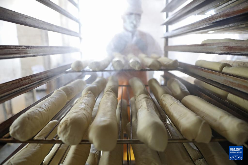 3月21日,工人在亮中橋鎮的昌圖福源食品有限公司車間內將做好的干豆腐制品放入熏烤架上。新華社記者 姚劍鋒 攝