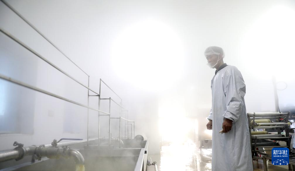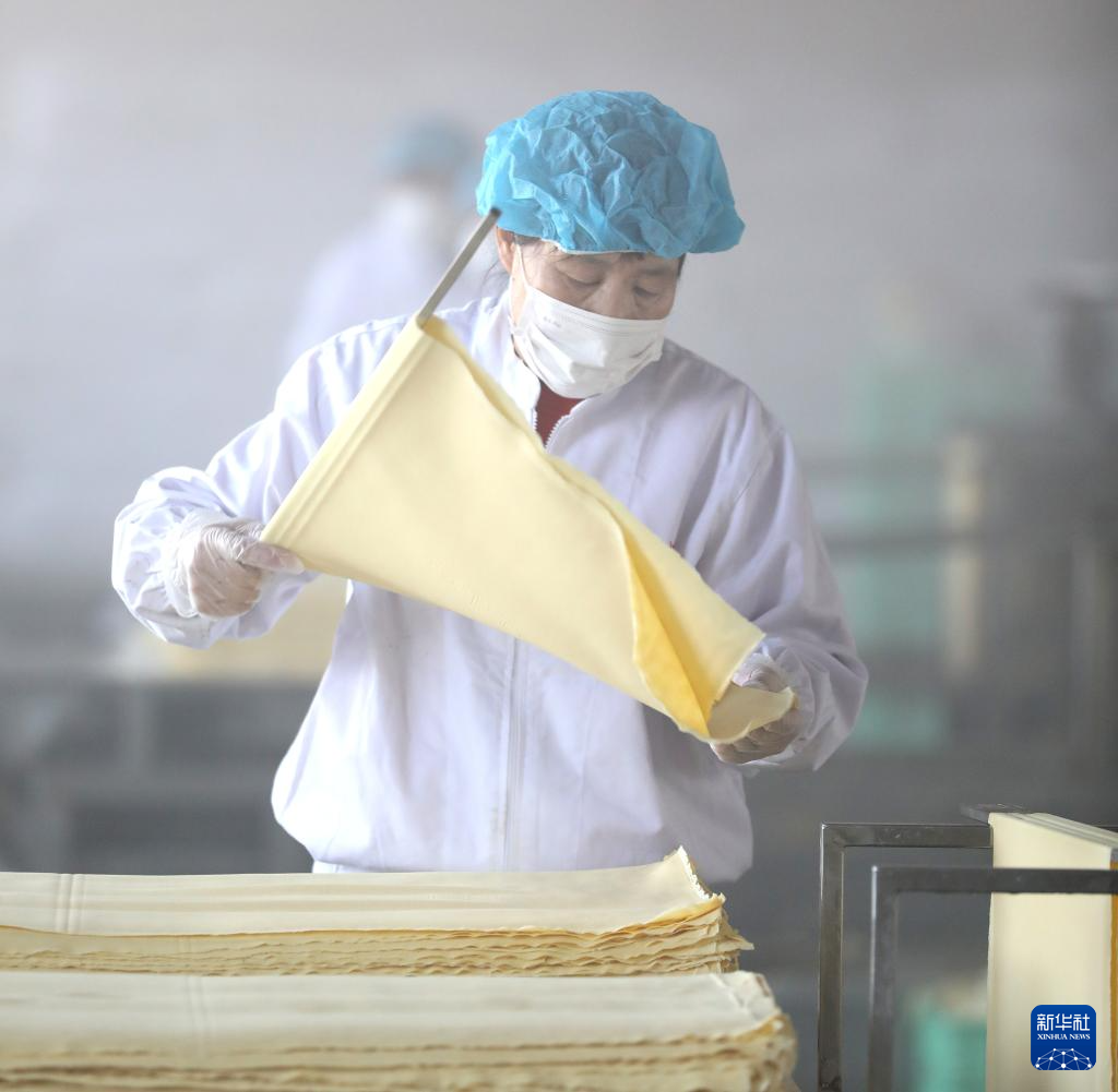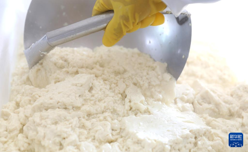 3月21日,工人在亮中橋鎮的昌圖紅瑞食品釀造有限公司車間內撈起制作干豆腐用的豆腐腦。新華社記者 姚劍鋒 攝