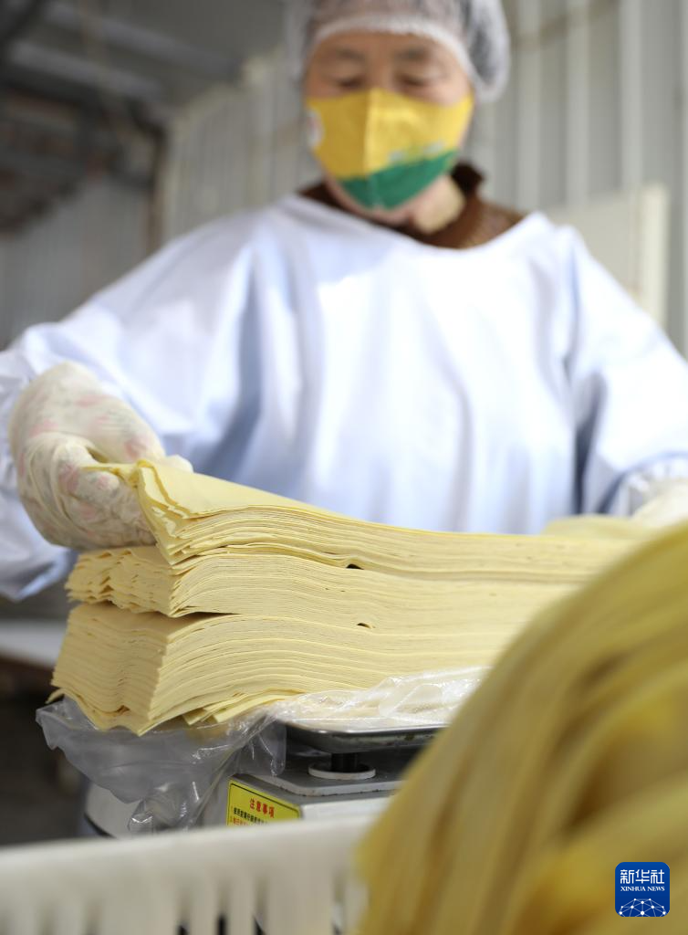 3月21日,工人在亮中橋鎮的昌圖紅瑞食品釀造有限公司車間內對制作好的干豆腐進行稱重。新華社記者 姚劍鋒 攝