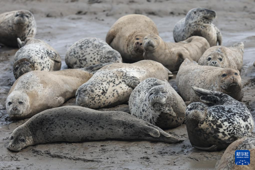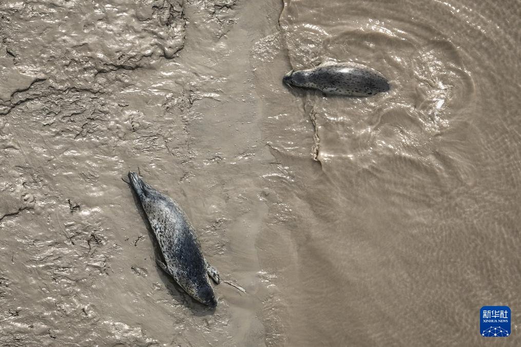 4月9日,西太平洋斑海豹在遼寧盤錦三道溝海域的灘涂上休息。新華社記者 潘昱龍 攝