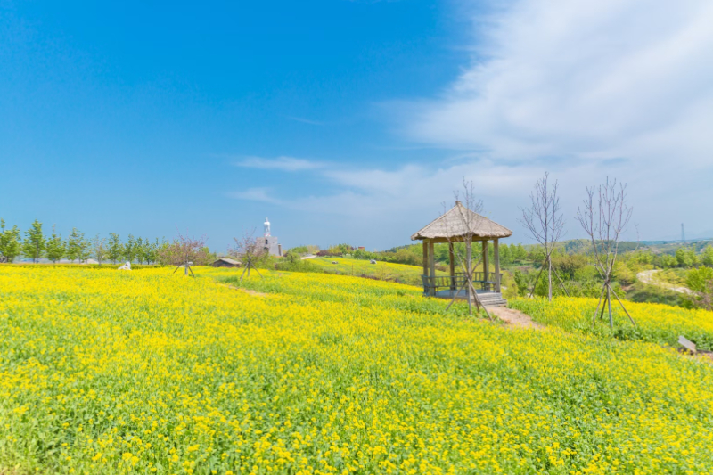 微風拂過,紫藤花隨風飄蕩。漫步在千米長的紫藤長廊下,仿佛置身于夢幻般的紫色世界。據介紹,這份“紫色浪漫”將持續至5月中下旬。離紫藤長廊不遠處的油菜花田內,油菜花花開正艷,燦爛奪目,形成一片金燦燦的花海。
