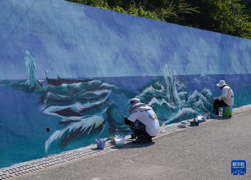 6月17日,工作人員在丹東大鹿島進行墻體彩繪。新華社記者 樊雨晴 攝pagebreak