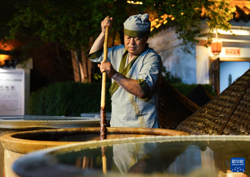 6月12日,在位于營口老街的營口大醬園內,工作人員展示大醬制作工藝。新華社記者 樊雨晴 攝pagebreak