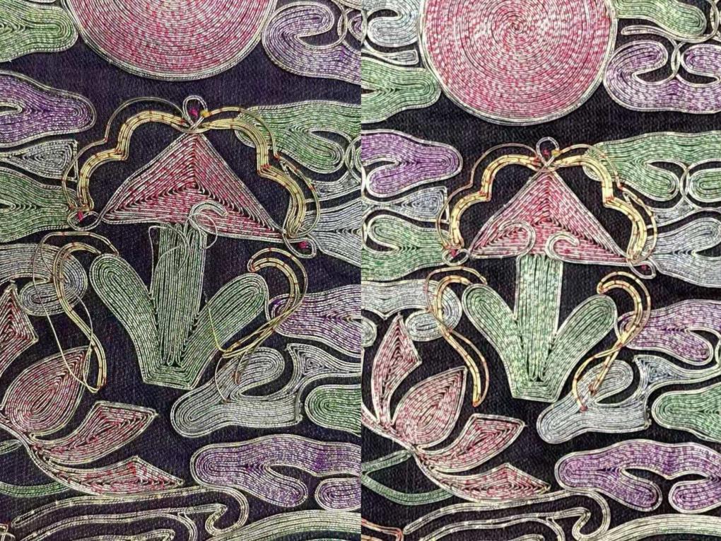 展覽中展出的“清藍緞平金龍銅釘棉甲”吸引了不少觀眾的目光。張瑩說:“這件棉甲由金鈕扣袢聯綴成一整體,為乾隆帝御用大閱甲。修復重點為盤金繡復原,即將金線、銀線盤成圖案,再用繡線將其釘縫固定于面料上。在修復時,使用釘線法進行金線復位及固定,同時在缺失的部位補充金線,有效解決盤金線脫落等病害問題?!?/p>