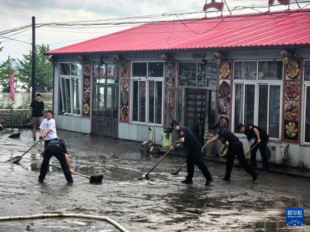 7月31日,丹東虎山邊境派出所民警幫助受災群眾清理淤泥。新華社發(李政科 攝)pagebreak