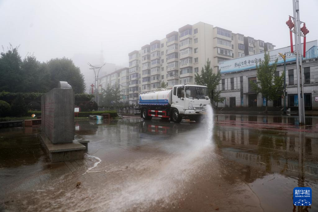 8月1日,作業車輛在丹東市濱江中路清理淤泥。新華社記者 龍雷 攝