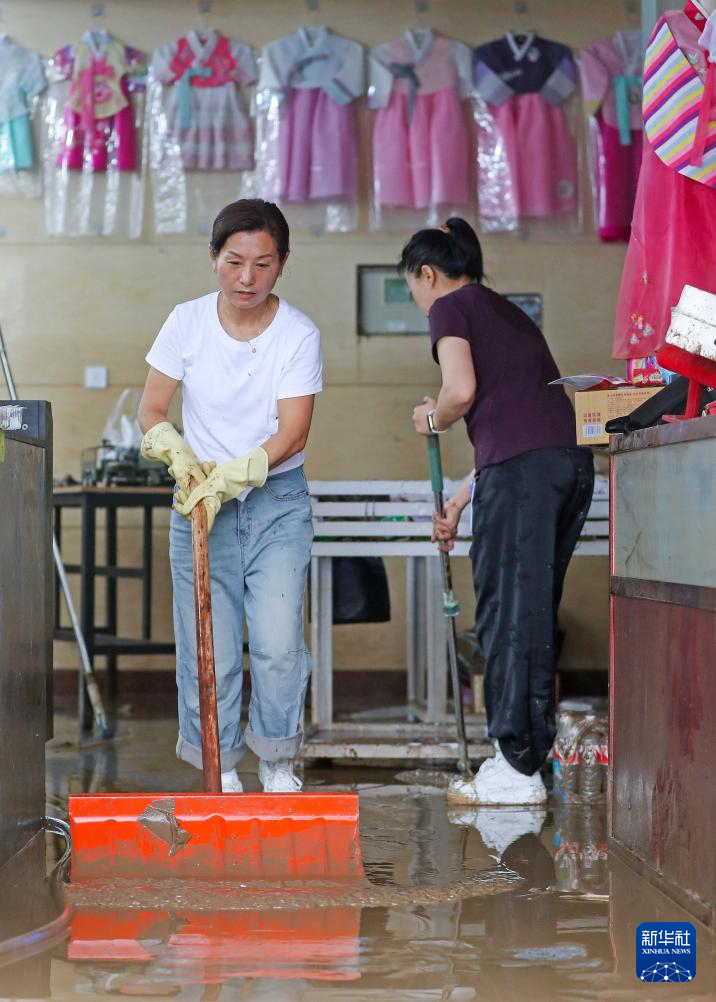 8月1日,在丹東市濱江中路,受災商戶清理店內淤泥為營業做準備。新華社記者 龍雷 攝pagebreak