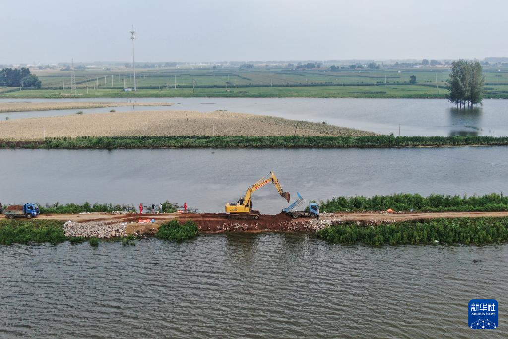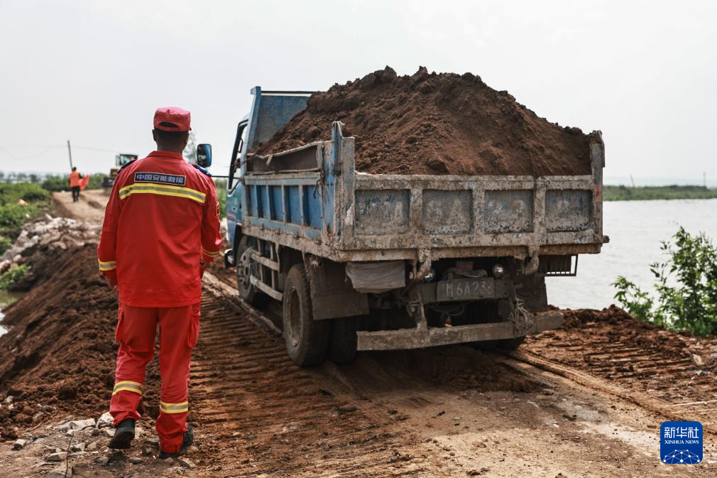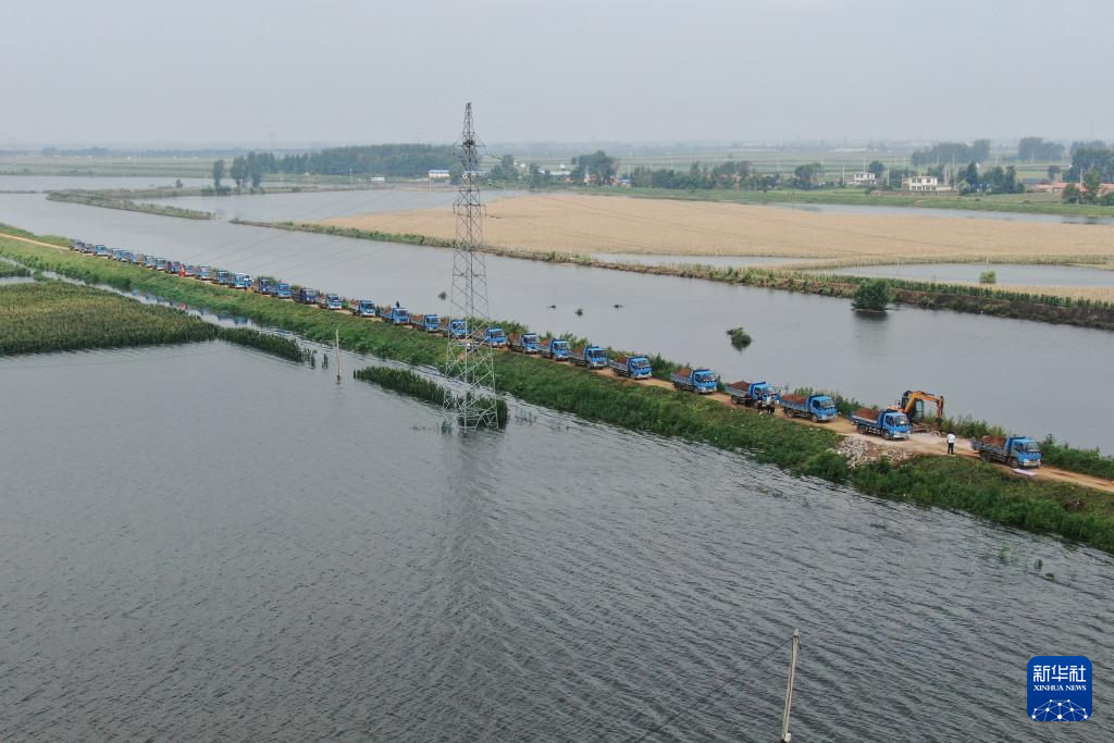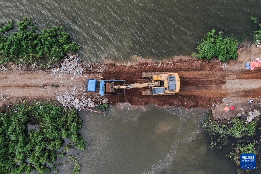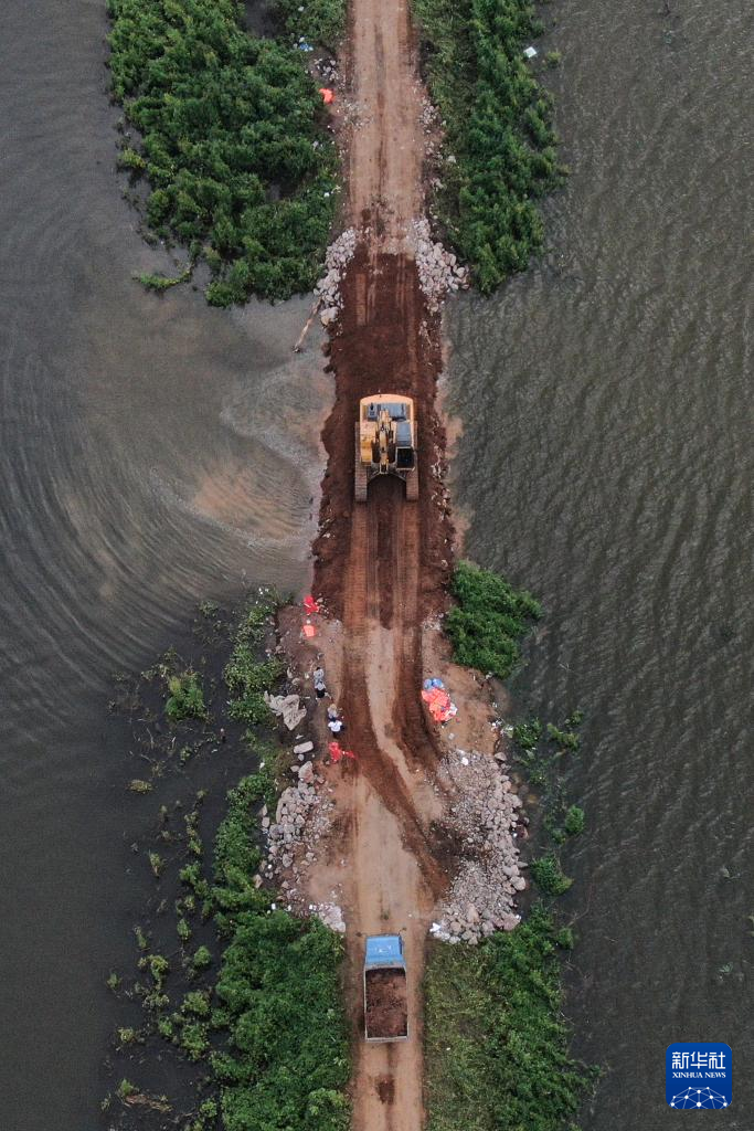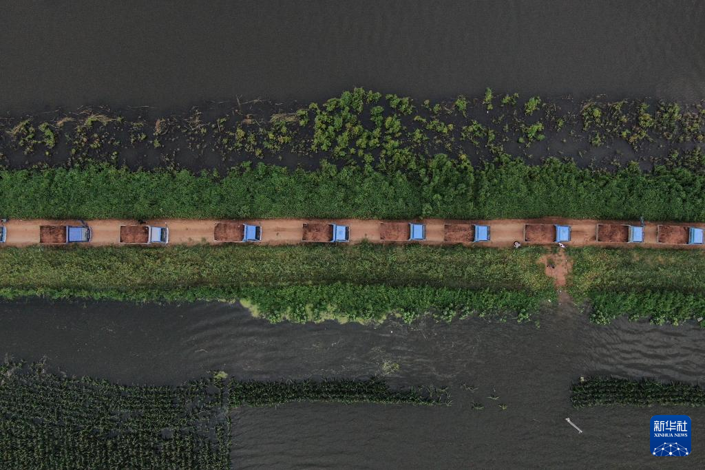8月7日,搶險人員運送物料加固河堤(無人機照片)。