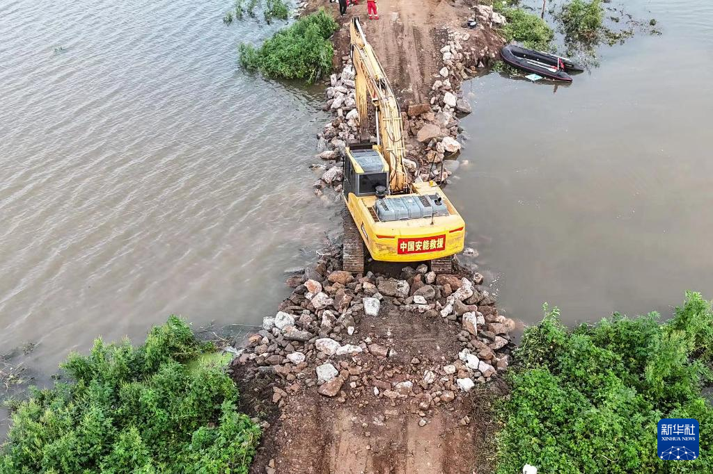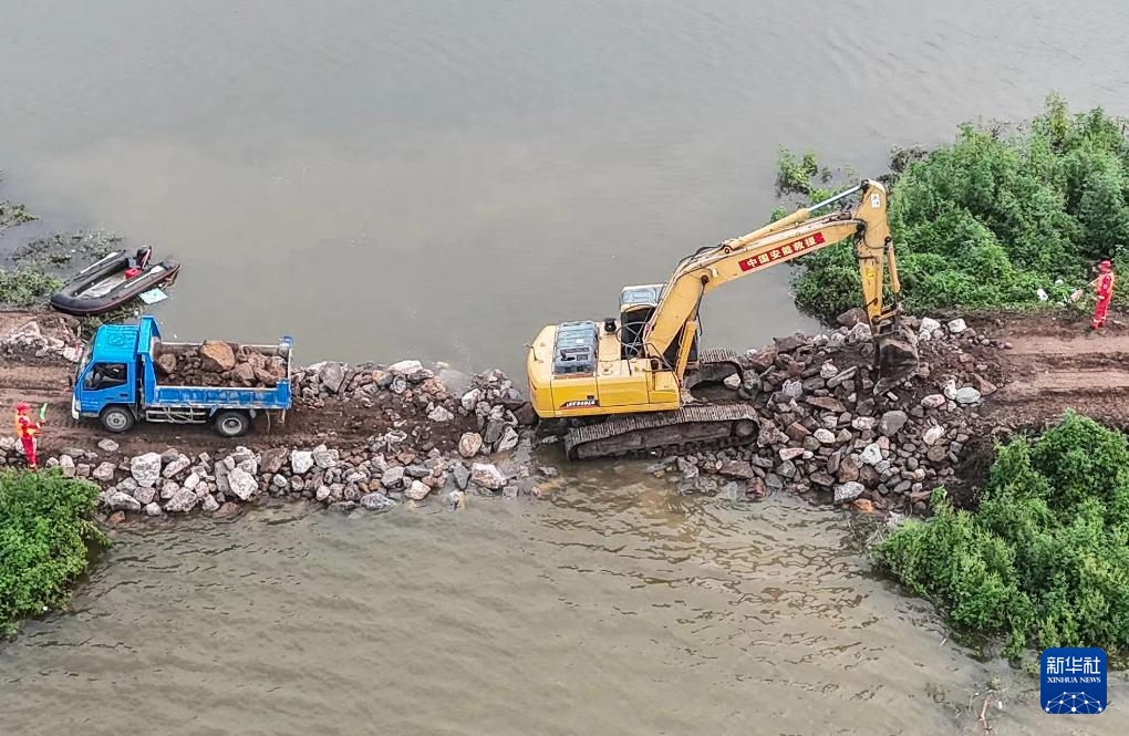 8月7日,搶險人員在現場進行加固工作(無人機照片)。