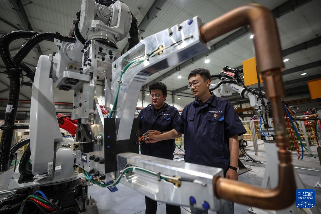 6月3日,沈陽新松機器人自動化股份有限公司的機器人研發工程師在調試點焊機器人。