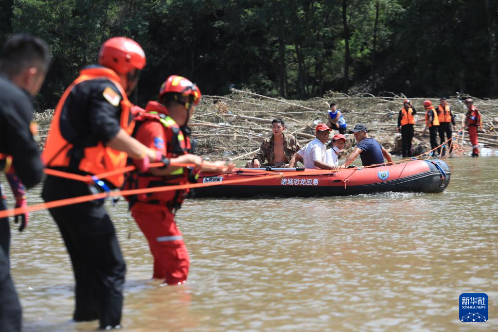 8月23日,在葫蘆島市建昌縣黑山科鄉,救援隊員用橡皮艇幫助受災群眾渡河。