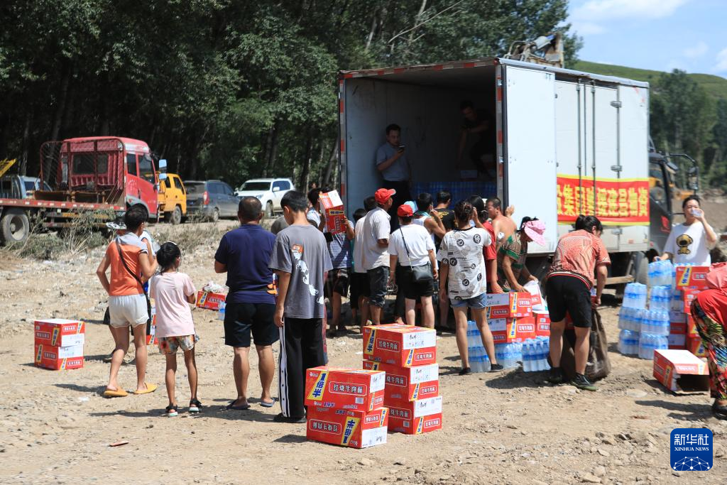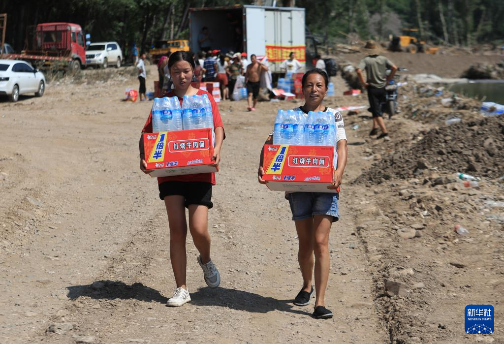 8月23日,在葫蘆島市建昌縣黑山科鄉,受災群眾在領取救災物資。