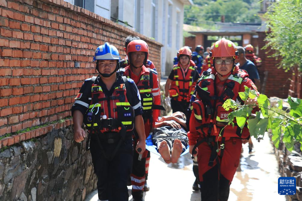 8月23日,在葫蘆島市建昌縣黑山科鄉二道河子村,救援隊員用擔架抬出一名急需就醫的老人。