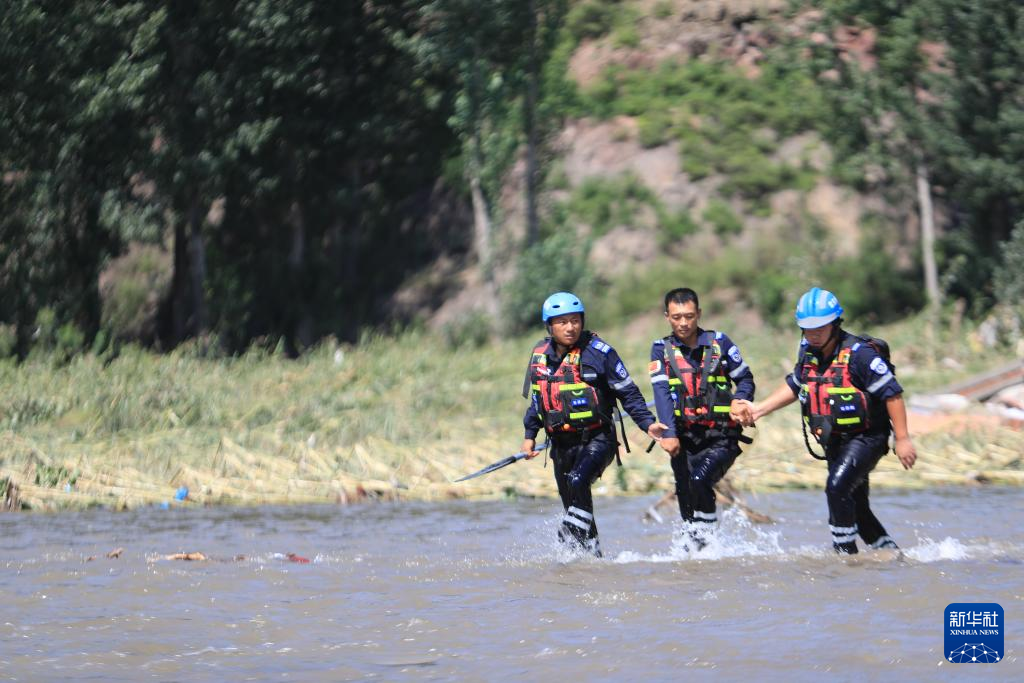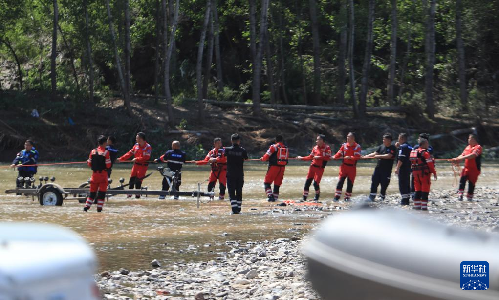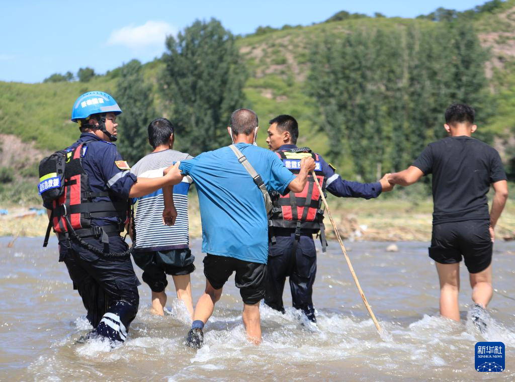 8月23日,在葫蘆島市建昌縣黑山科鄉,救援隊員幫助受災群眾渡河后返回。