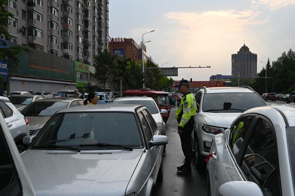 開原市公安交通警察大隊的交警正在疏導校園周邊的車輛。(開原市紀委監委供圖)
