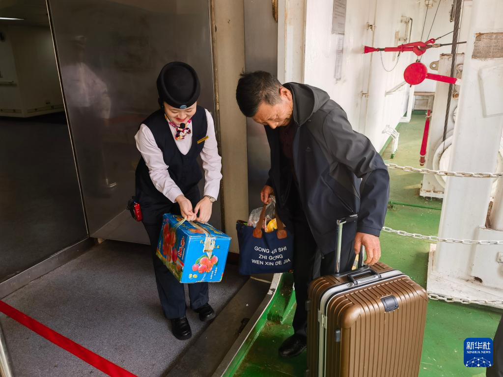 9月26日,客運員在中鐵渤海號渡船幫助旅客提行李。