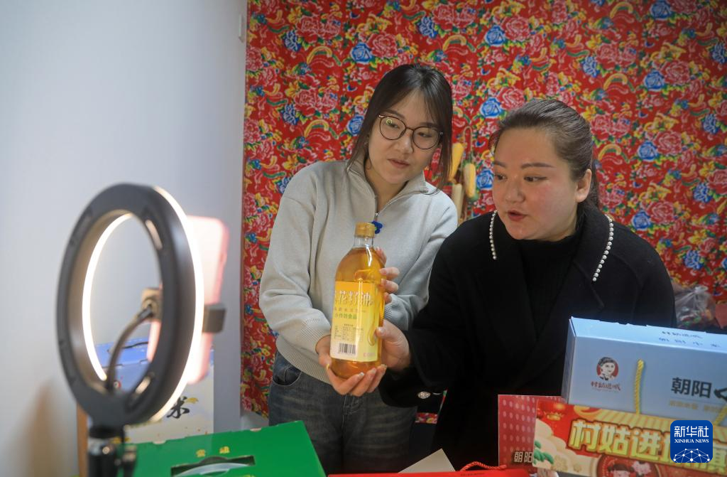 王穎(右)和大學生一起直播賣貨。新華社記者楊青 攝