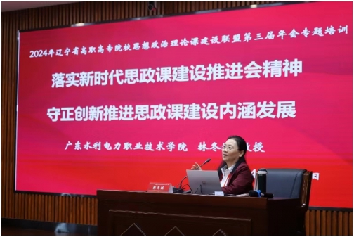 本屆年會設置了主旨報告、教學展示、校園參觀和實踐研修四個階段。在主旨報告階段,廣東水利水電職業技術學院林冬妹教授以《落實新時代思政課建設推進會精神 守正創新推進思政課建設內涵發展》為題作報告。在教學展示階段,教育部第三屆全國思政課教學展示活動高職高專組特等獎獲得者、河南機電職業學院思政課教師韓慧敏和全國高職高專院校思政課第一場“萌新磨課、骨干練兵”活動中,“萌新磨課”組教學展示一等獎獲得者、沈陽職業技術學院思政課教師孫雨欣分別進行了課程教學展示并分享了個人備賽經驗。