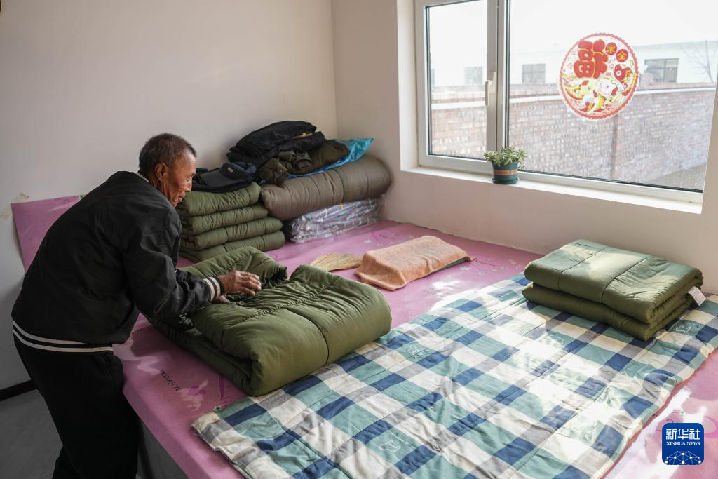 11月8日,遼寧省葫蘆島市綏中縣祝家溝村村民在集中安置重建住房內整理被褥。
