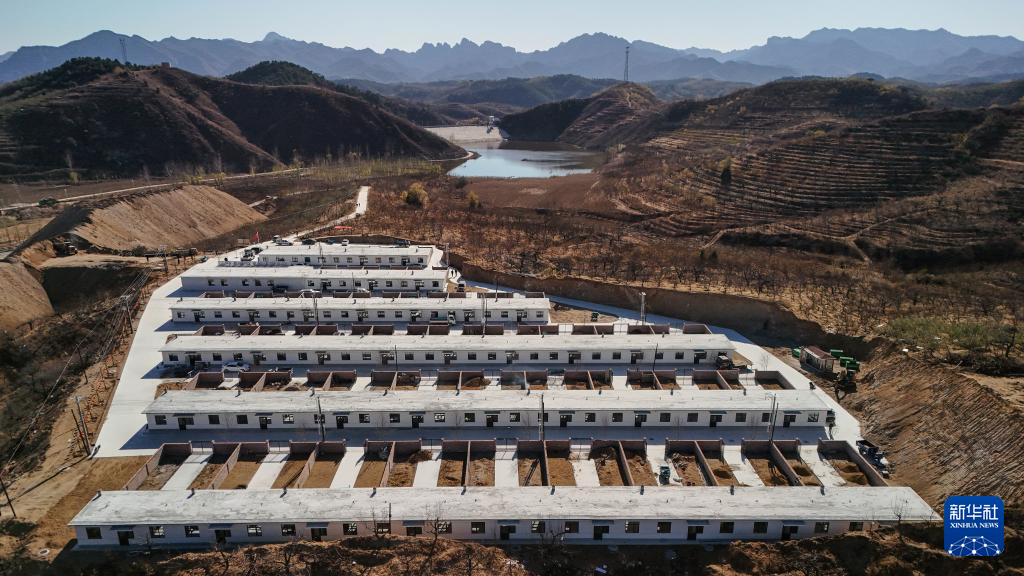 這是11月5日拍攝的遼寧省葫蘆島市綏中縣祝家溝村集中安置重建住房(左側白色房屋,無人機照片)。
