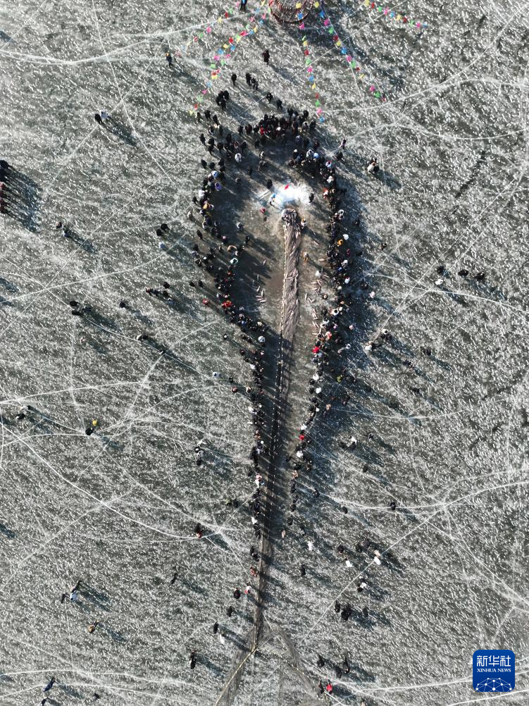 這是1月11日在沈陽康平臥龍湖拍攝的冬捕出魚現場(無人機照片)。