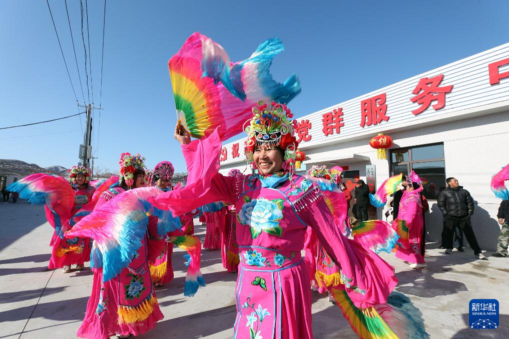 1月28日,葫蘆島市綏中縣明水滿族鄉祝家溝村村民在重建新房的村黨群服務中心前扭秧歌。
