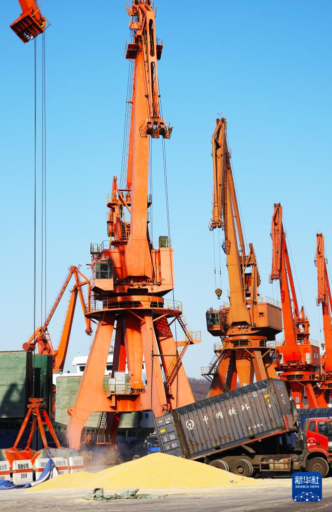 2月18日,在營口港鲅魚圈港區,裝滿玉米的敞頂箱在碼頭卸貨。