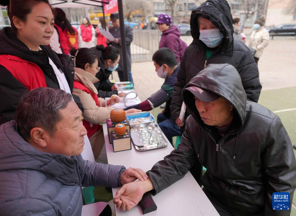 3月4日,在沈陽市鐵西區重工新村社區廣場,志愿者為居民義診。