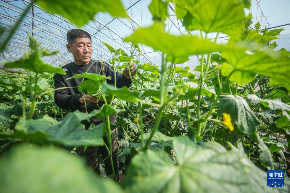 3月6日,在遼寧省葫蘆島市綏中縣,種植戶在黃瓜種植大棚查看黃瓜長勢。